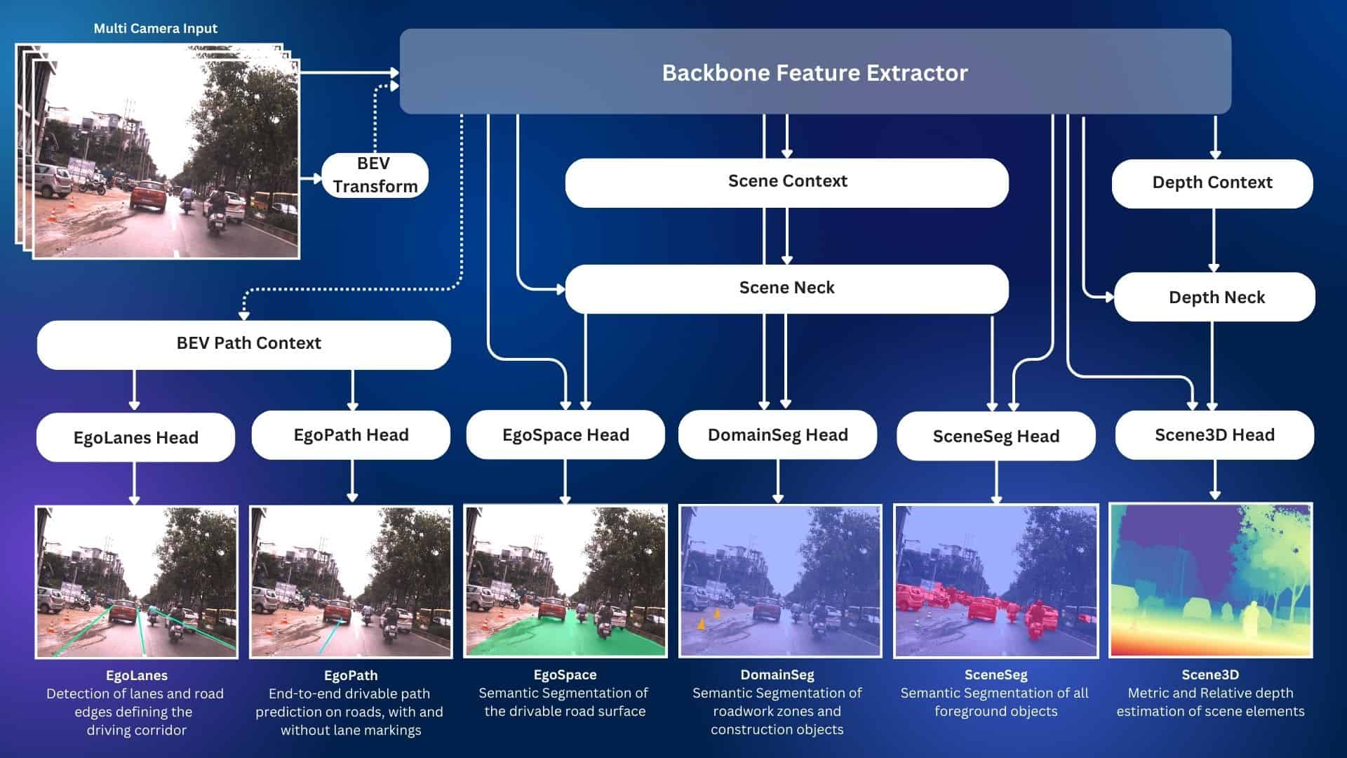 For example, the AutoSeg algorithm is a "HydraNet" that has a single backbone that split into several heads for lane lines, ego path, free space, segmentation, objects, and 3D. The outputs of these heads are then passed to the deep planner.