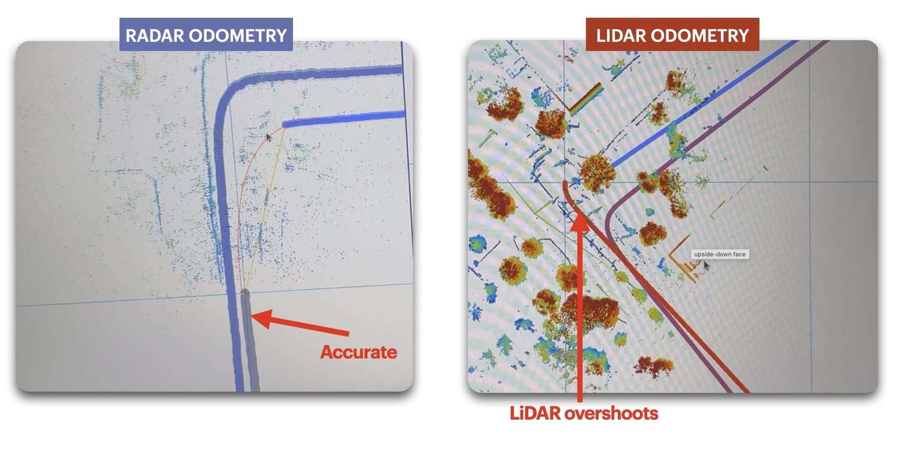 While the RADAR Odometry uses the velocity information and can accurately spot moving points, LiDAR doesn't, and as a result, overshoots!